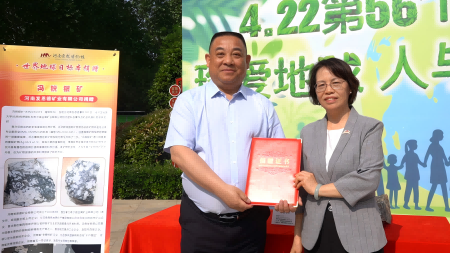 4月20日,河南省矿业协会联合河南自然博物馆等单位在郑州举办第56个“世界地球日”主题宣传周启动仪式。河南省矿业协会会长冯进城出席,并代表协会向河南自然博物馆捐赠了产自三门峡市卢氏县的高纯石英矿标本。河南省自然资源厅总规划师张传慧、国家自然博物馆副馆长张玉光、河南自然博物馆馆长徐莉、河南发恩德矿业有限公司总裁朋礼常等领导嘉宾出席仪式。郑东新区外国语小学师生、大学生志愿者及现场100多名观众共同见证捐赠过程,并参与科普活动。